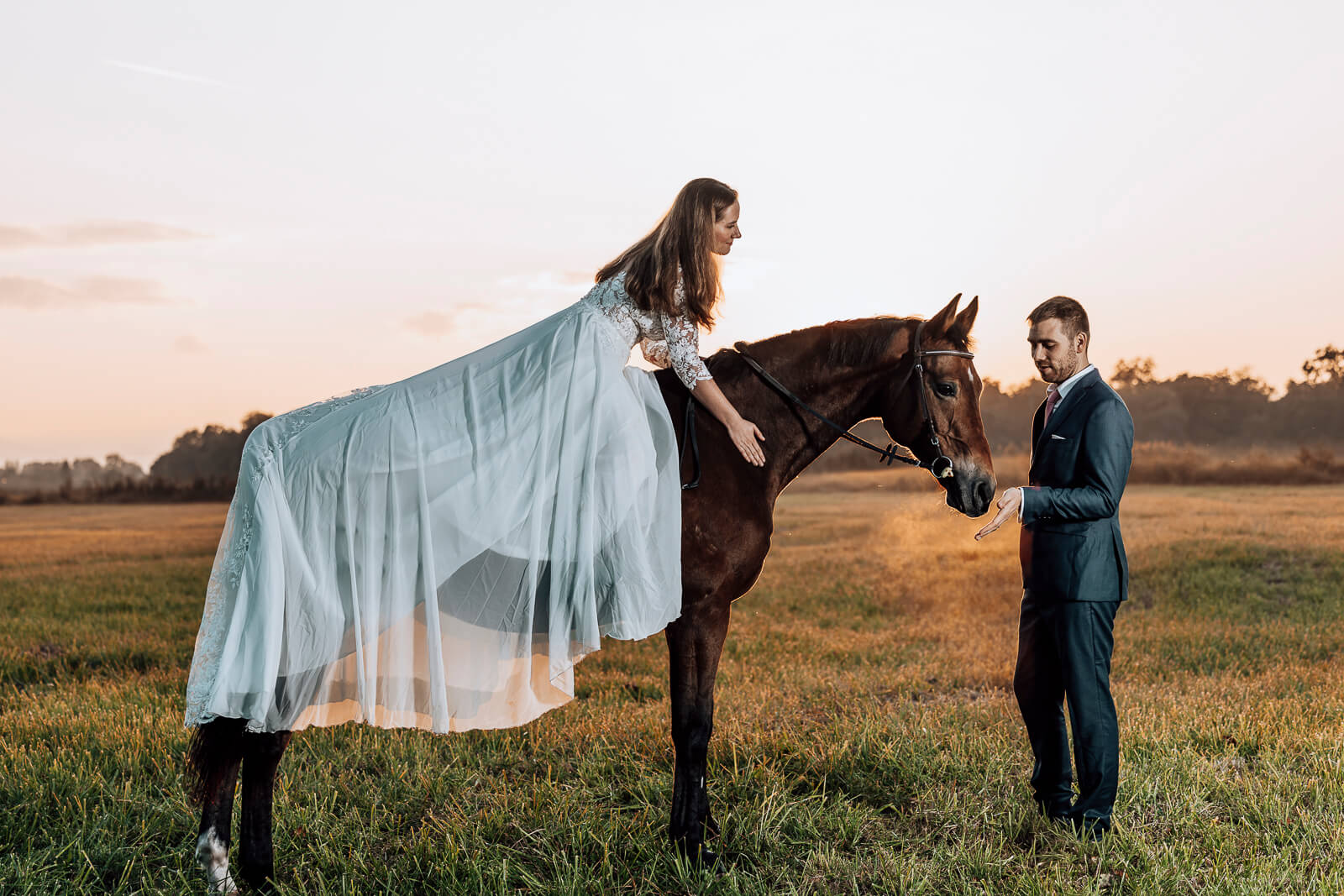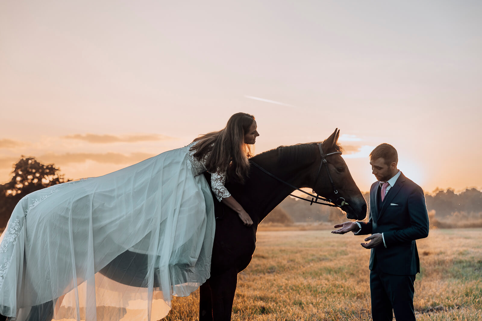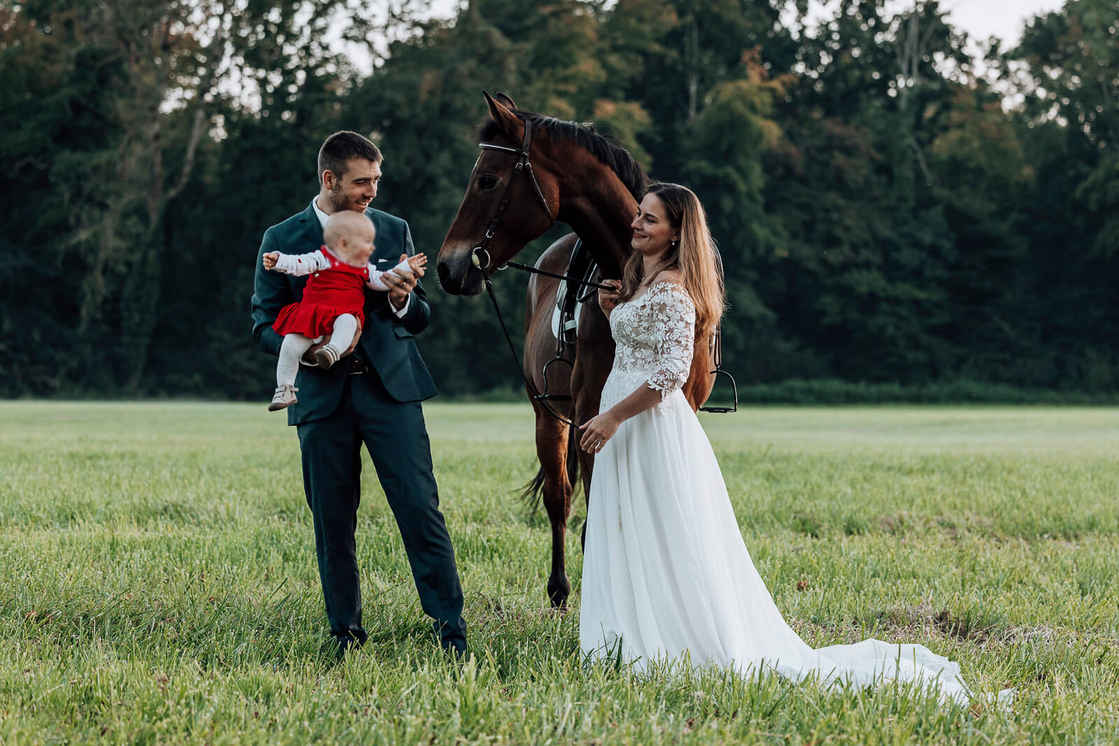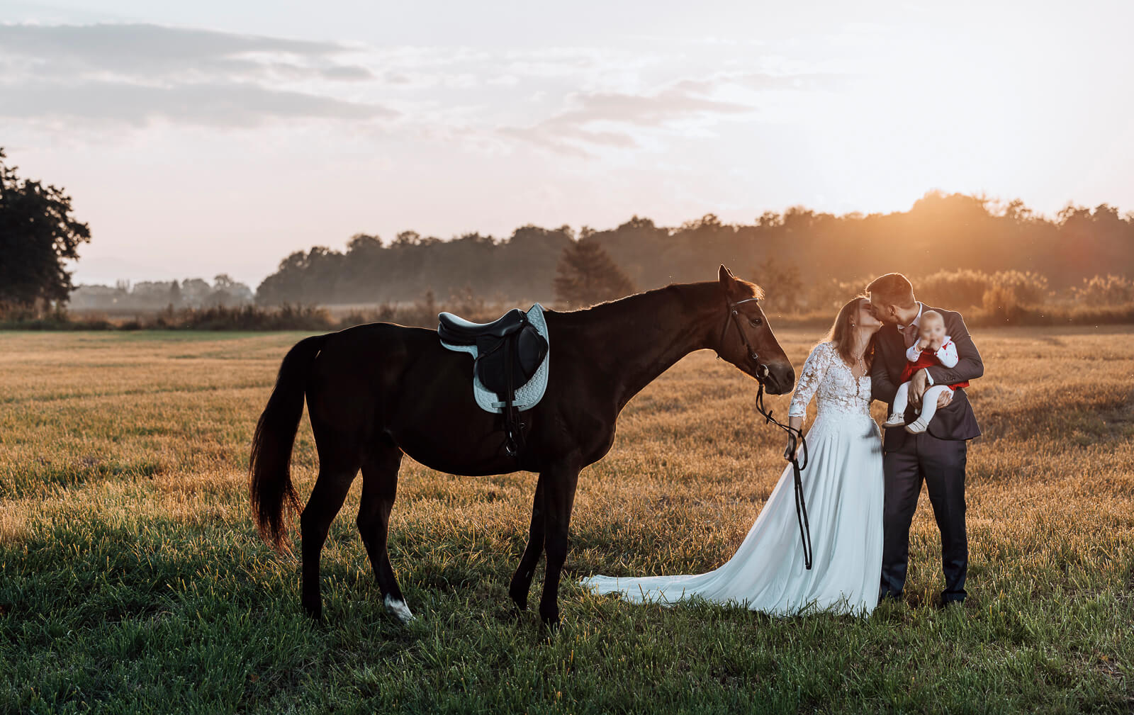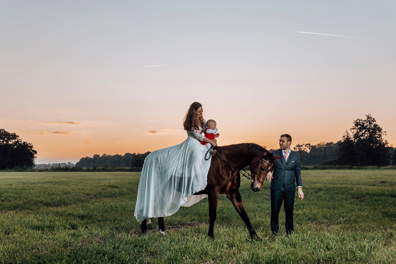 Lorène et Loïc ont imaginé cette séance comme une parenthèse familiale. Le décor s’est imposé naturellement : la lumière chaude d’un coucher de soleil, la campagne paisible, et Ecir des Verrières, le cheval de Lorène, compagnon précieux et symbole fort de son histoire personnelle.
