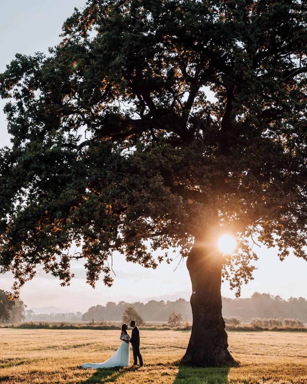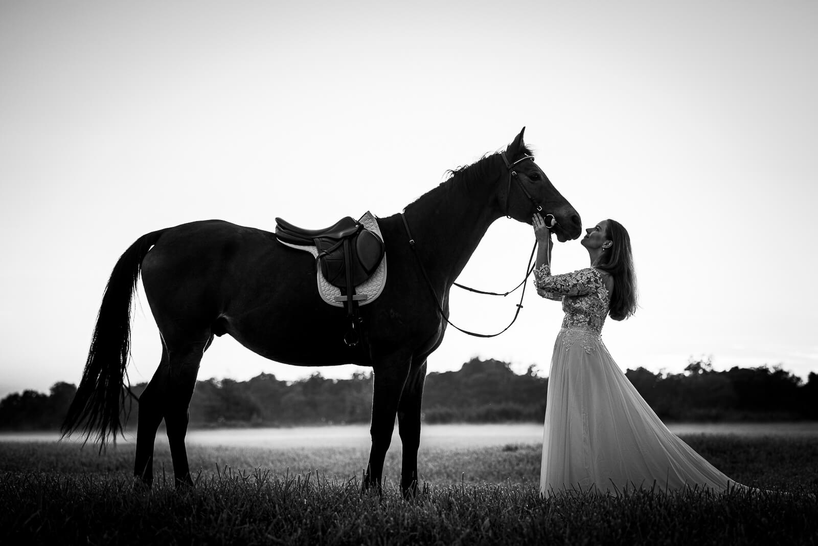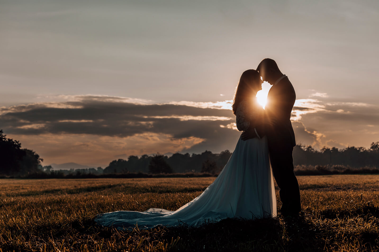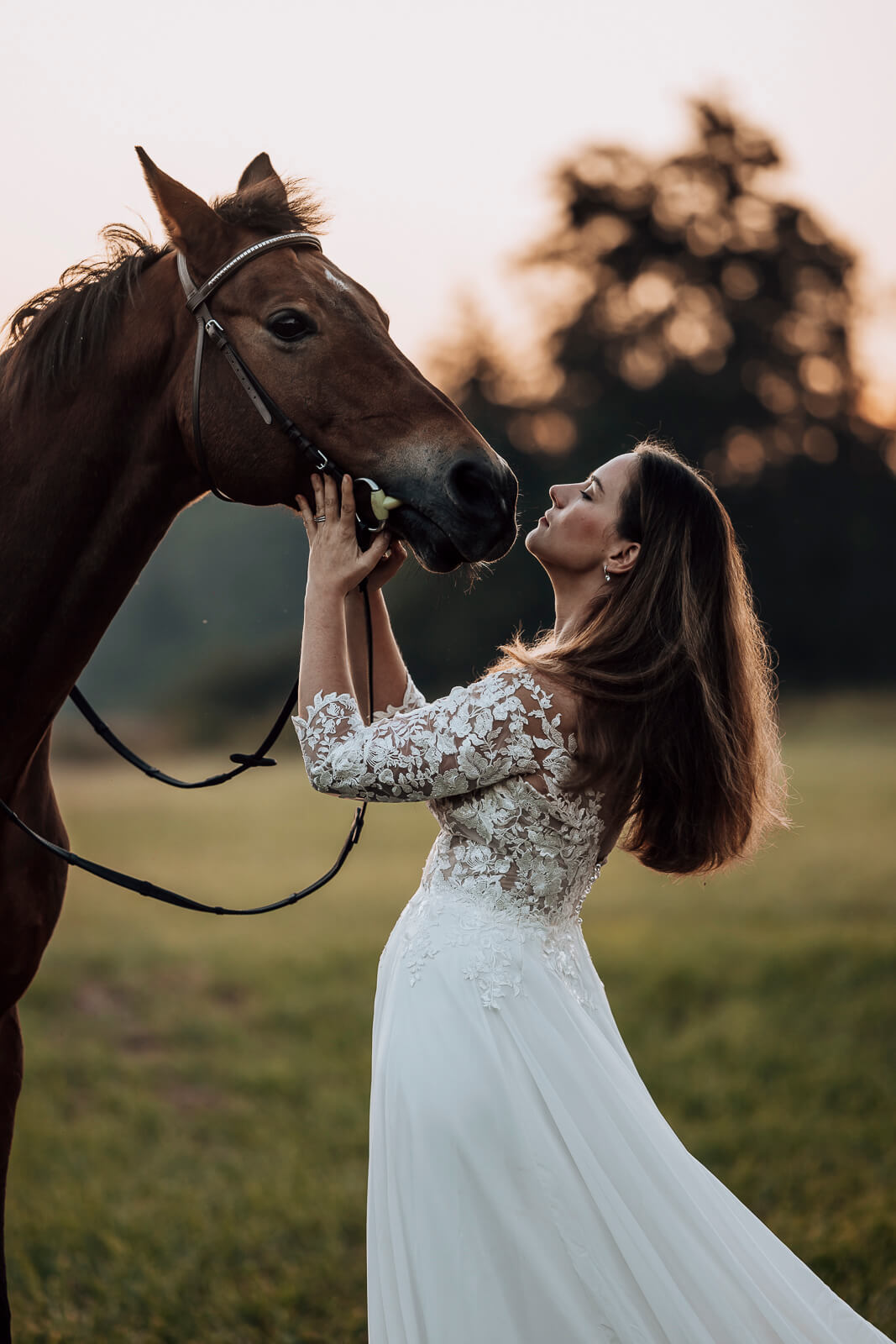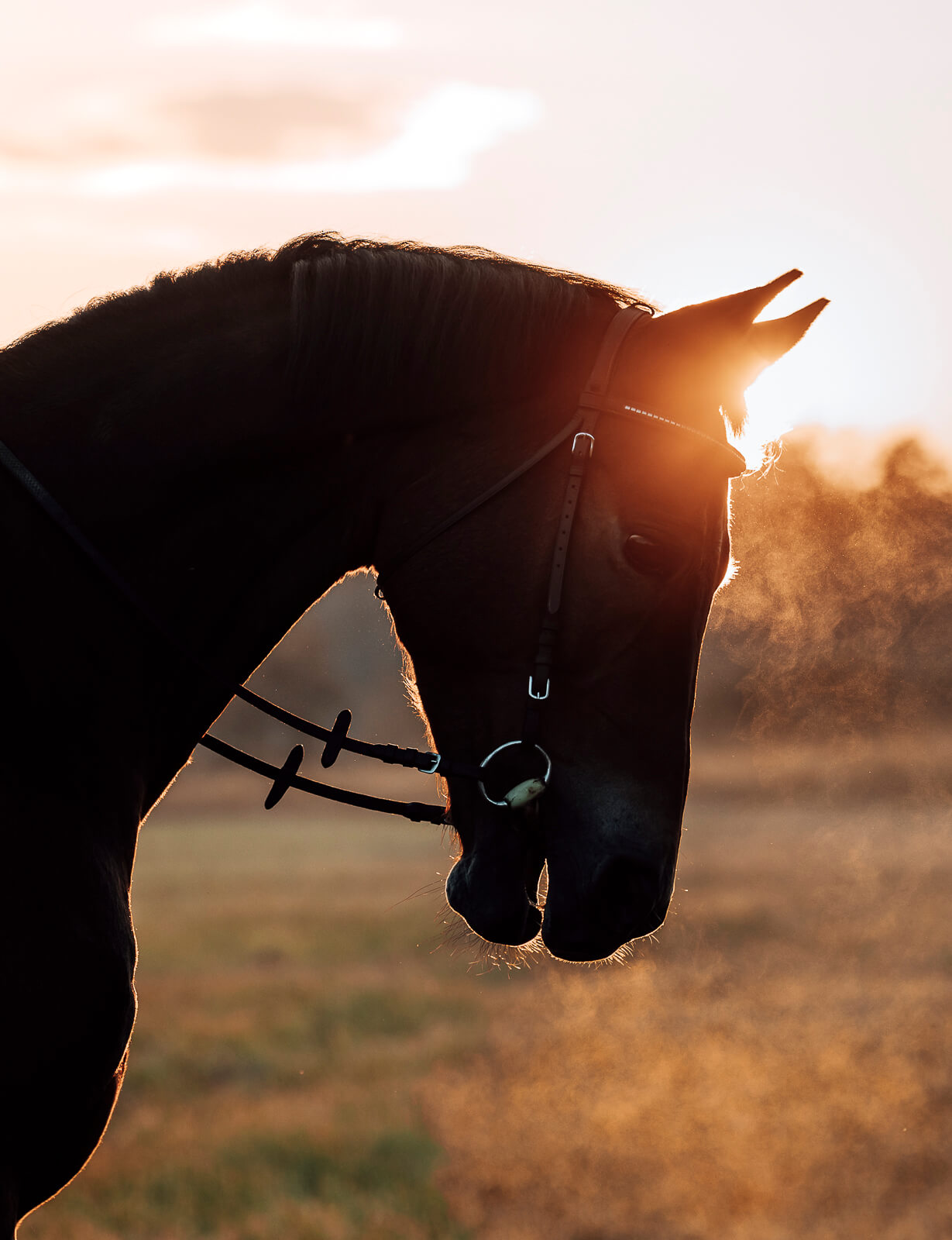 Lorène et Loïc ont imaginé cette séance comme une parenthèse familiale. Le décor s’est imposé naturellement : la lumière chaude d’un coucher de soleil, la campagne paisible, et Ecir des Verrières, le cheval de Lorène, compagnon précieux et symbole fort de son histoire personnelle.